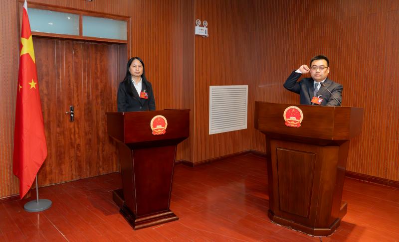 曹迎春监誓,新当选的市监察委员会主任丁志国向宪法宣誓